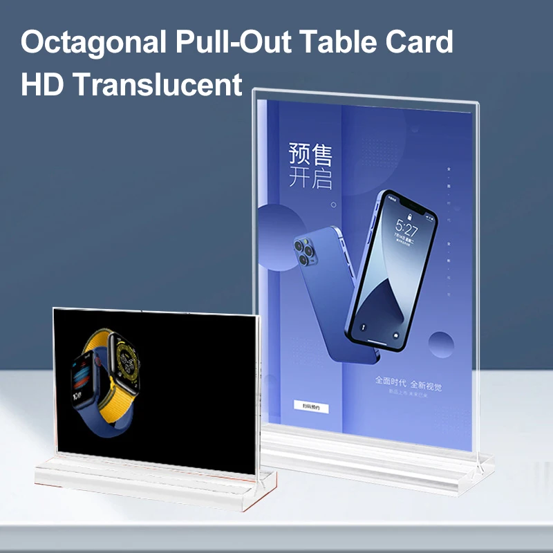JIN DA presenta una tarjeta de mesa retráctil octogonal personalizada, muy vendida, y un soporte para letreros en acrílico, diseñados para bodas, eventos y necesidades publicitarias. Este producto combina una presentación clara y profesional con un diseño duradero. Es compatible con tamaños A4, A5 y A6, lo que lo hace versátil para menús, horarios, planos de ubicación de asientos, mensajes especiales o material promocional. El mecanismo retráctil octogonal es sencillo de usar: los paneles se deslizan suavemente, permitiéndole actualizar el contenido rápidamente y sin complicaciones. Su base en forma de T ofrece un soporte estable, manteniendo el letrero visible desde múltiples ángulos.