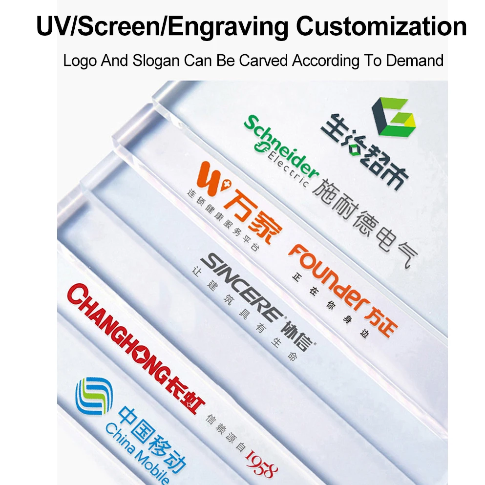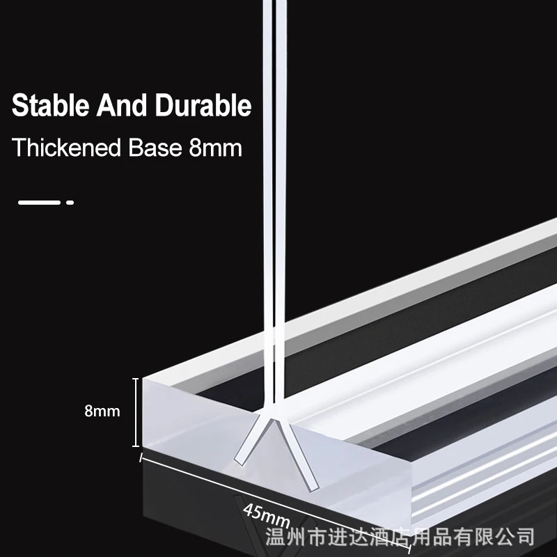 El producto también satisface las necesidades de marca. Las opciones de personalización le permiten agregar logotipos, colores o tipografías específicas para que coincidan con los temas del evento o la identidad corporativa. Esto hace que el soporte sea adecuado para bodas, eventos empresariales, tiendas efímeras y otras ocasiones en las que resulta fundamental una presentación de marca coherente. La combinación de acrílico transparente, esquinas redondeadas y un soporte en forma de T crea un fondo profesional para su material impreso.