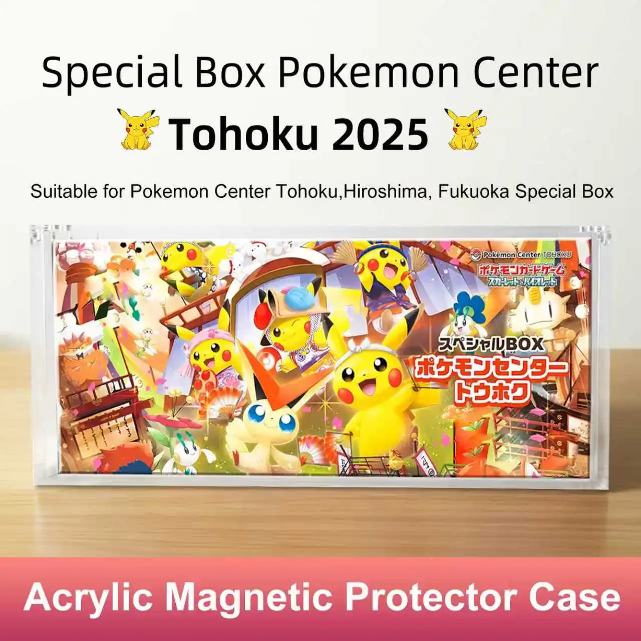 Este producto es un estuche protector especialmente diseñado para la caja especial Pokemon PTCG del Centro de Pokemon Tohoku 2025, y también es compatible con las cajas de Tohoku, Hiroshima y Fukuoka. Protege su caja de edición especial contra arañazos, el polvo y el desgaste diario. Su carcasa de acrílico permite una visión clara para lucir el diseño artístico, al tiempo que protege la caja en su interior. El estuche incluye un cierre magnético que se engancha fácilmente, lo que facilita su apertura y cierre sin preocuparse de que la tapa se suelte. Este sellado magnético mantiene todo seguro y aporta un aspecto limpio y pulido.
